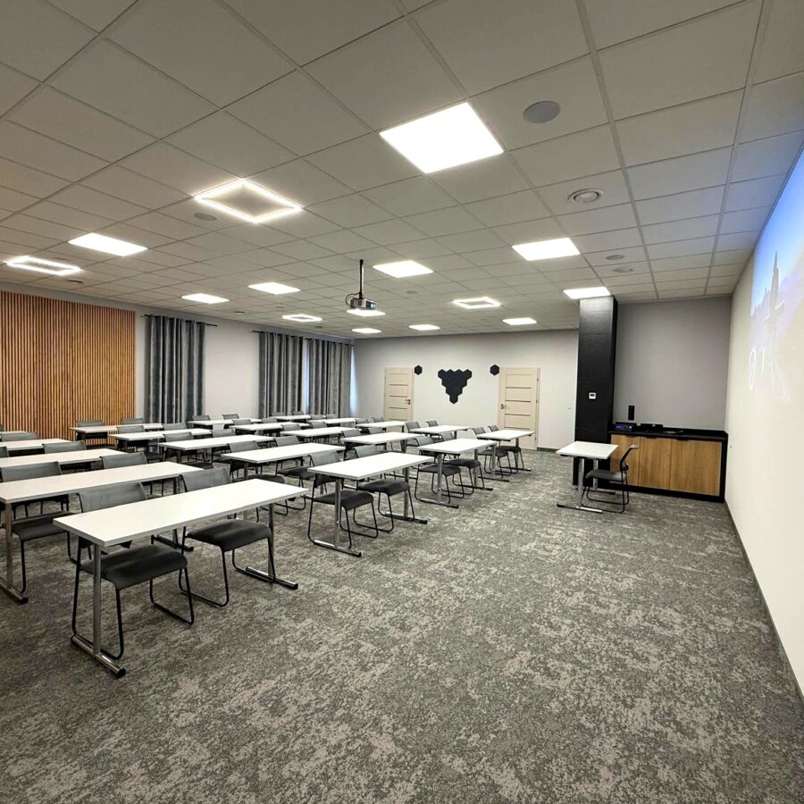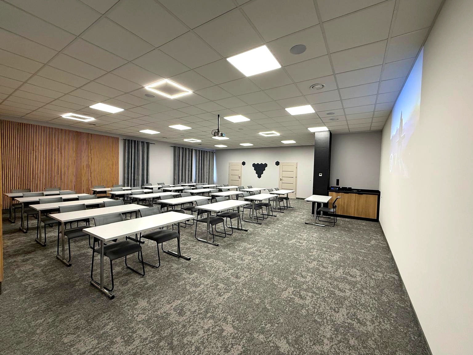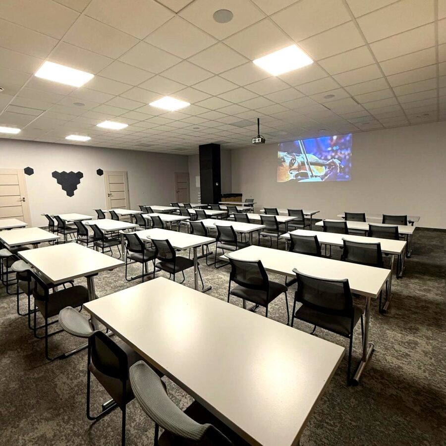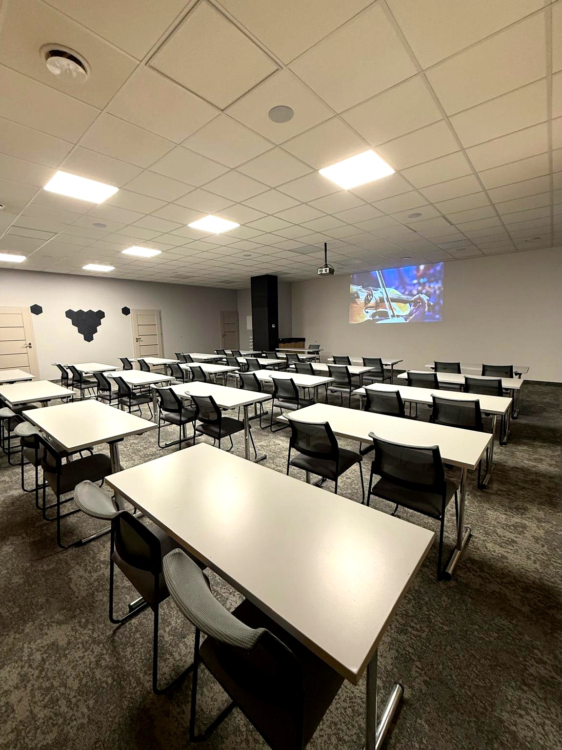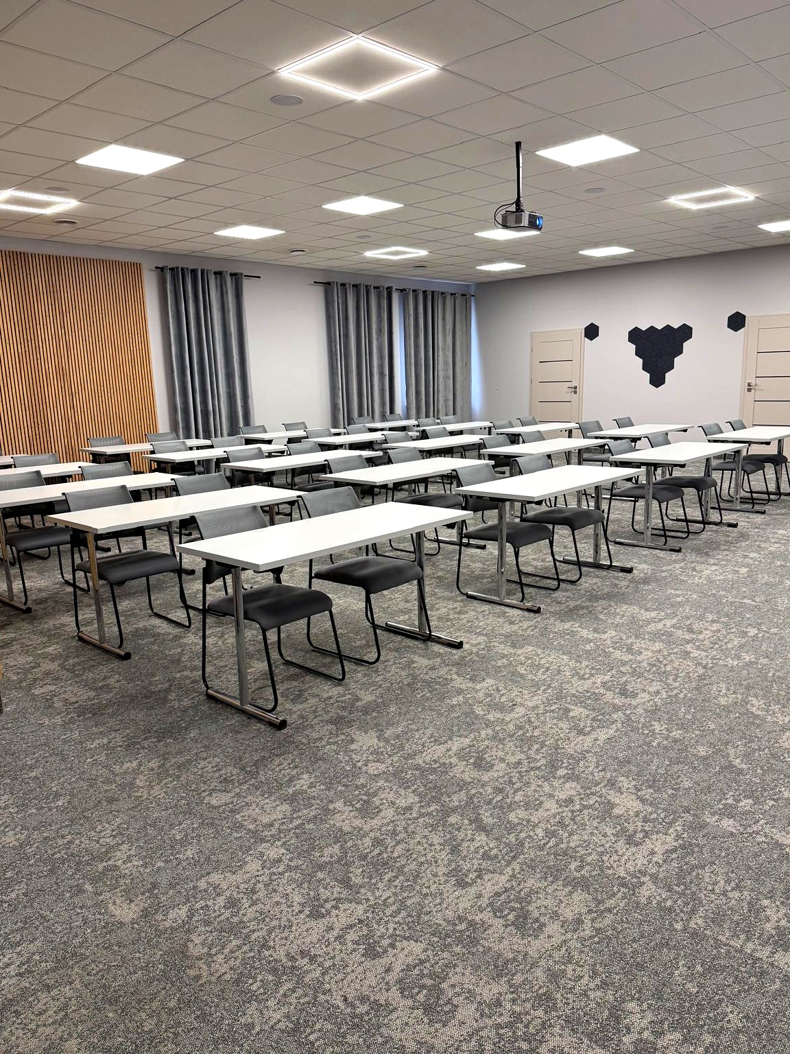Główna sala, w układzie prostokątnym, pomieści do 60 osób i daje pełną swobodę aranżacji — od szkoleń, przez warsztaty, po większe spotkania zespołowe.