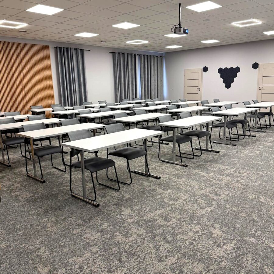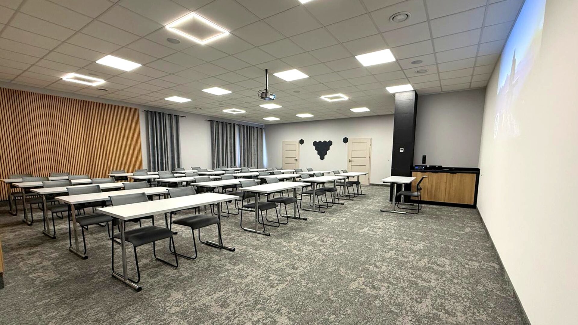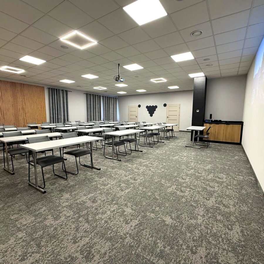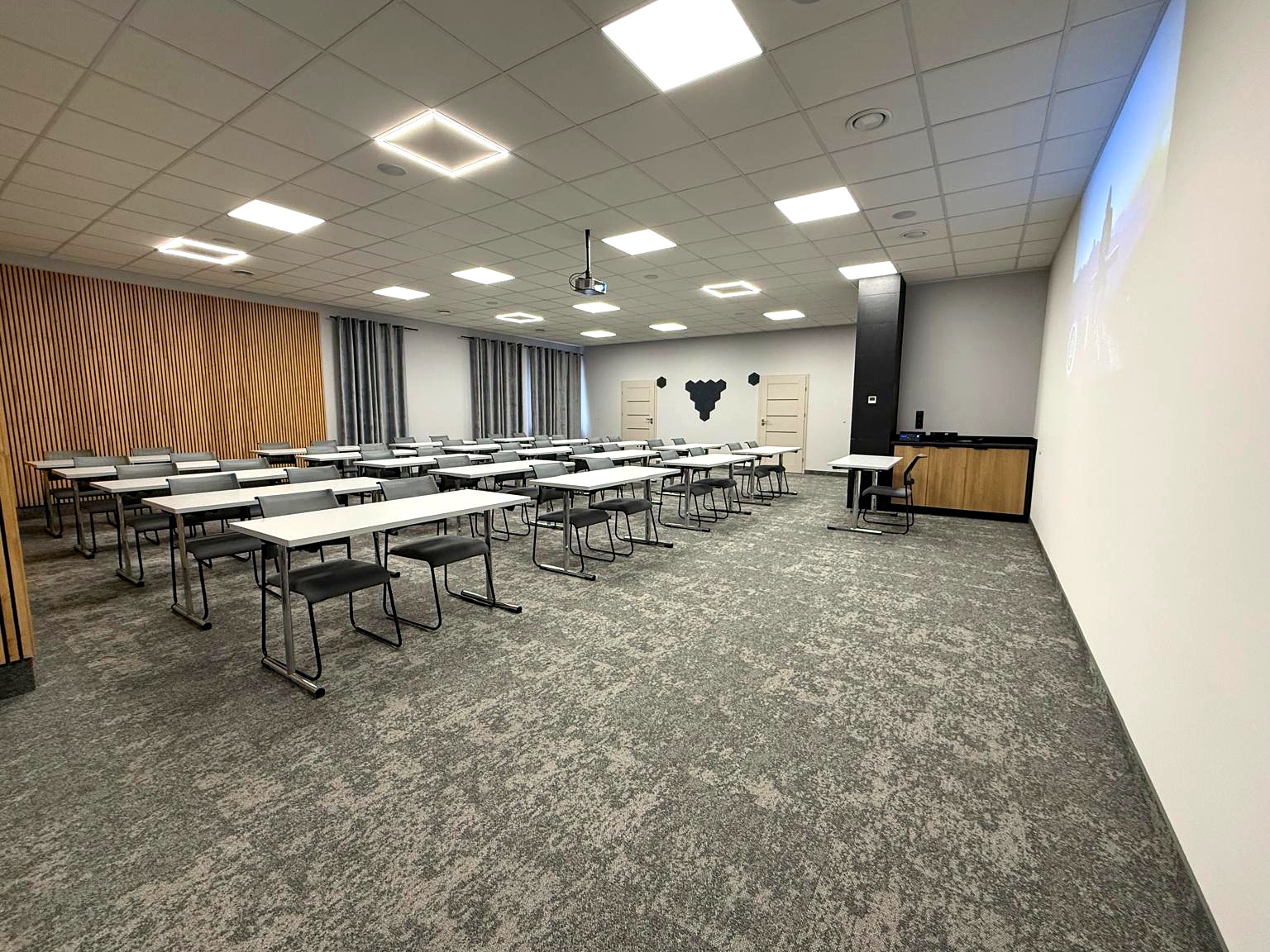 Główna sala, w układzie prostokątnym, pomieści do 60 osób i daje pełną swobodę aranżacji — od szkoleń, przez warsztaty, po większe spotkania zespołowe.