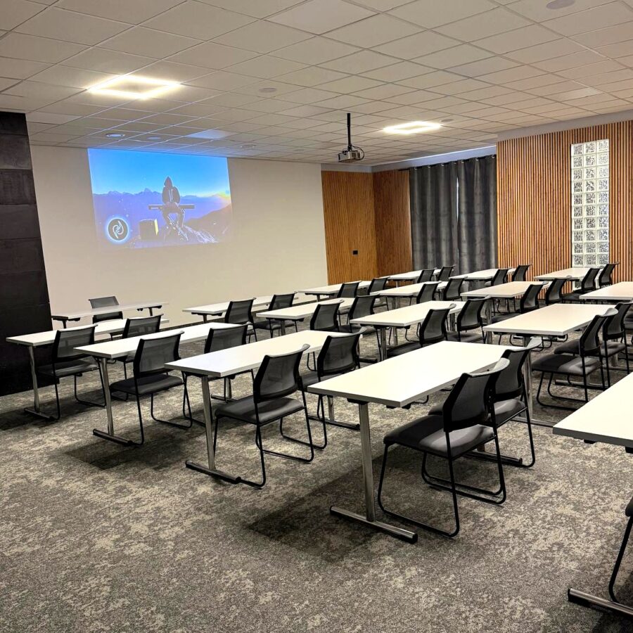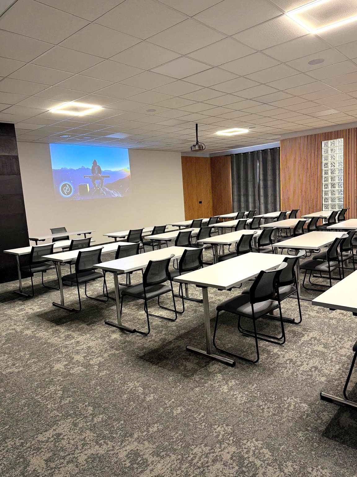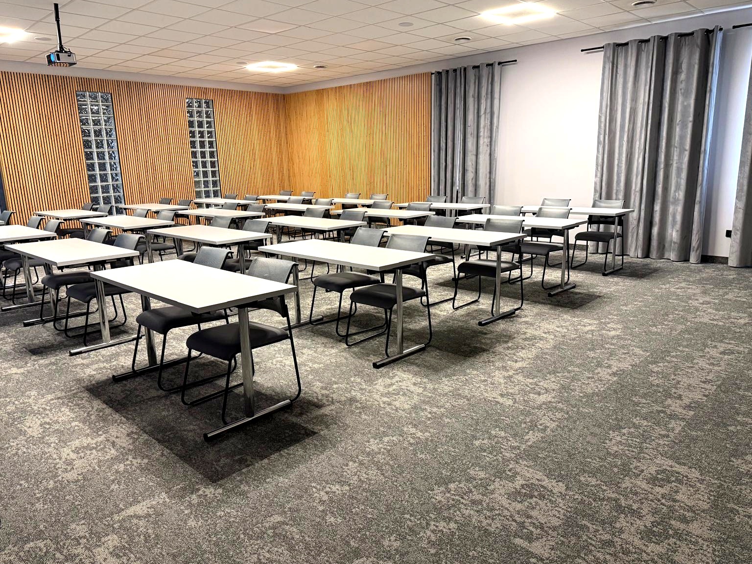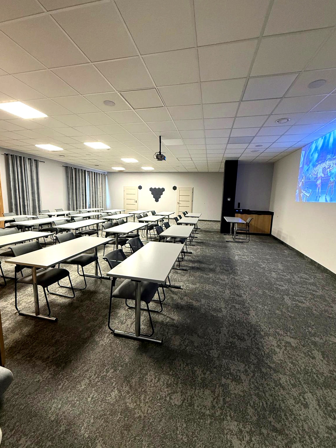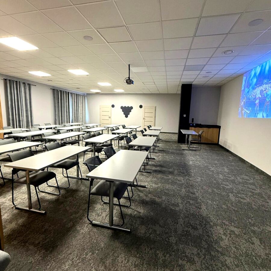 Główna sala, w układzie prostokątnym, pomieści do 60 osób i daje pełną swobodę aranżacji — od szkoleń, przez warsztaty, po większe spotkania zespołowe.