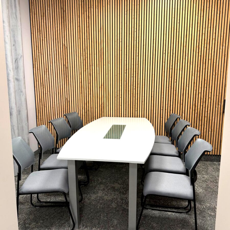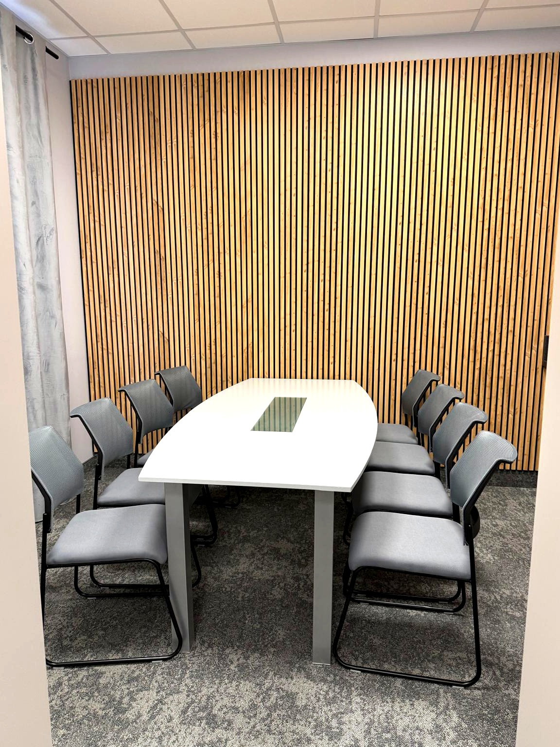 Tuż obok znajduje się kameralna sala konferencyjna z dużym stołem na 8 osób, idealna na spotkania zarządu, breakout sessions lub pracę w mniejszym gronie.